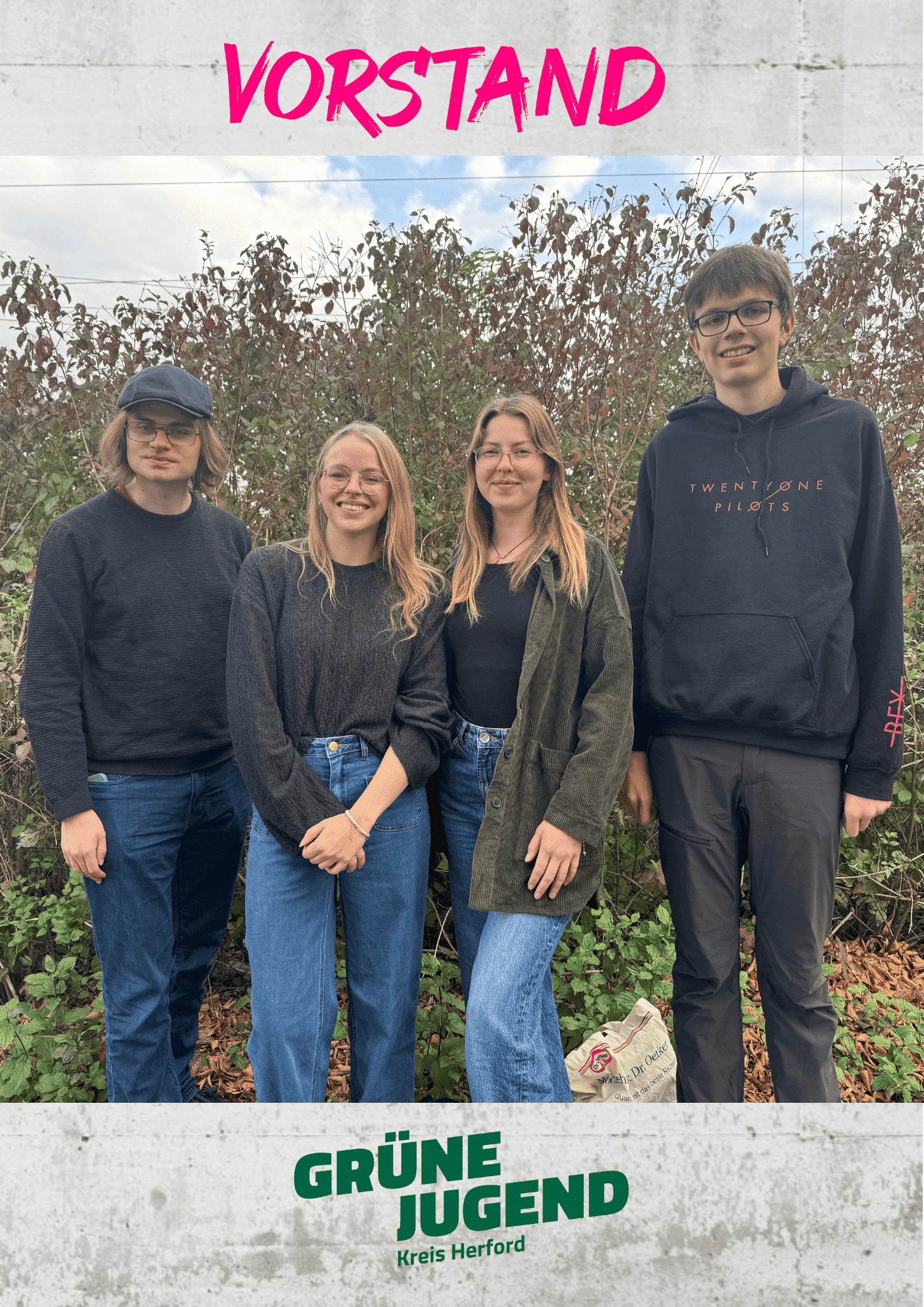 Der Vorstand der Grünen Jugend im Kreis Herford wurde am 10.08.2025 gewählt und vertritt die Grüne Jugend Kreis Herford nach innen und außen.